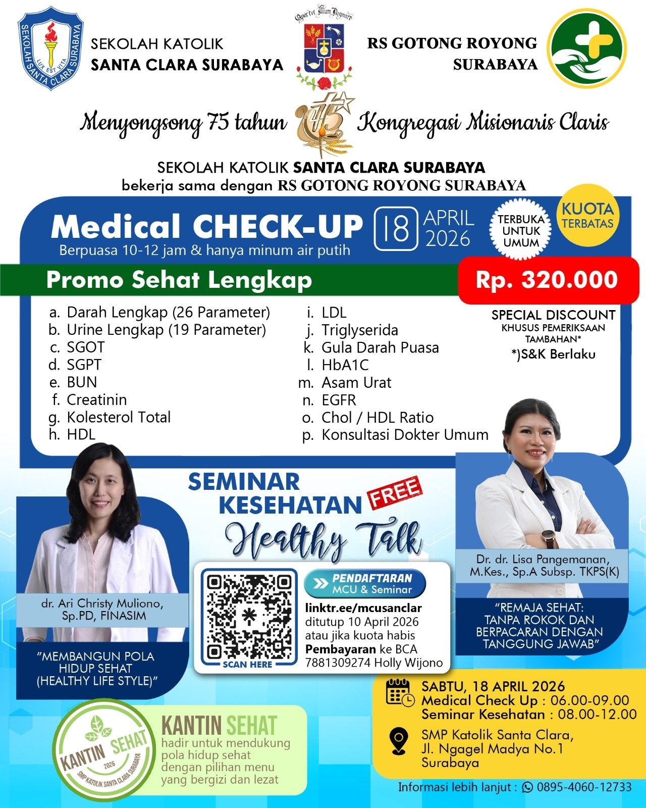 Dalam rangka menyongsong 75 tahun Kongregasi Misionaris Claris, Sekolah Katolik Santa Clara Surabaya bekerja sama dengan Rumah Sakit Gotong Royong Surabaya akan menyelenggarakan kegiatan: 🩺 MEDICAL CHECK UP 📅 Sabtu, 18 April 2026 ⏰ Pukul 06.00 – 09.00 WIB Selain itu, akan diselenggarakan pula: 🎤 Seminar Kesehatan (Healthy Talk) ⏰ Pukul 08.00 – 12.00 WIB Sebagai pelengkap kegiatan, tersedia juga Kantin Sehat dengan pilihan menu yang lezat dan bergizi untuk mendukung pola hidup sehat. Kegiatan ini