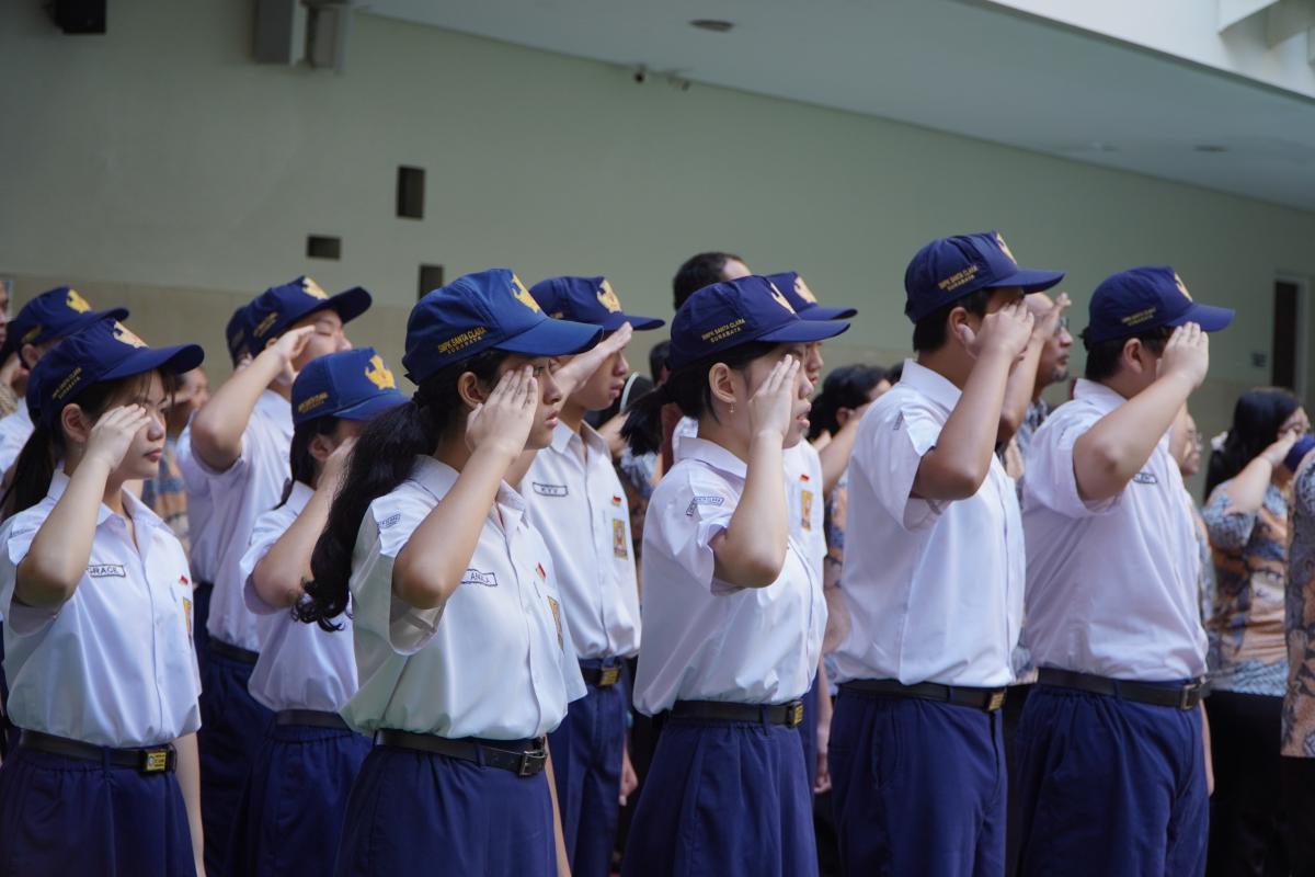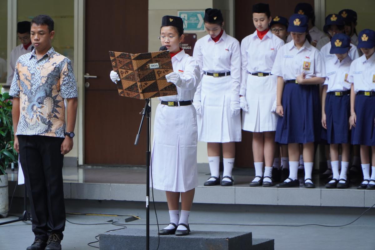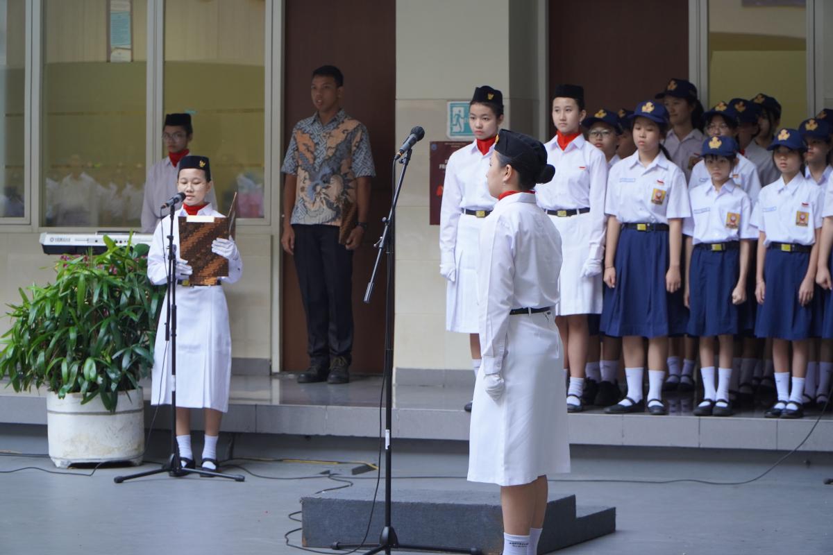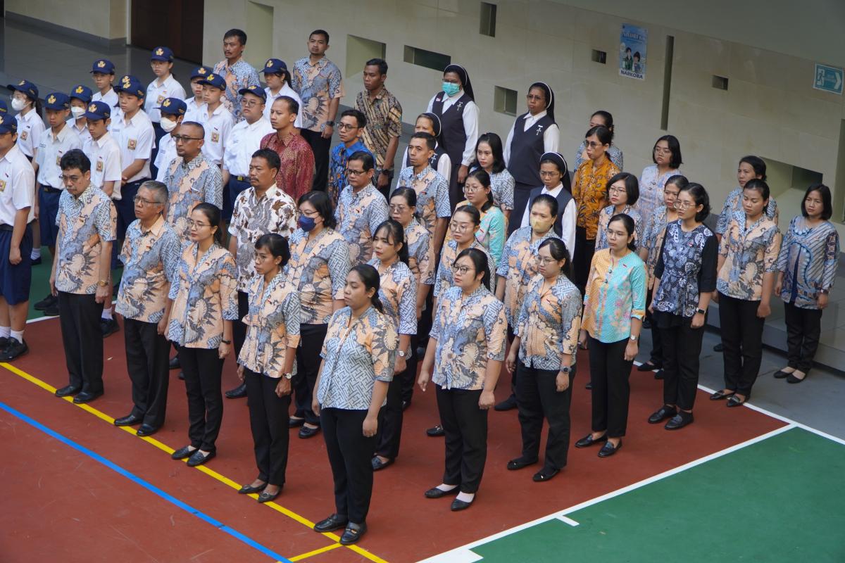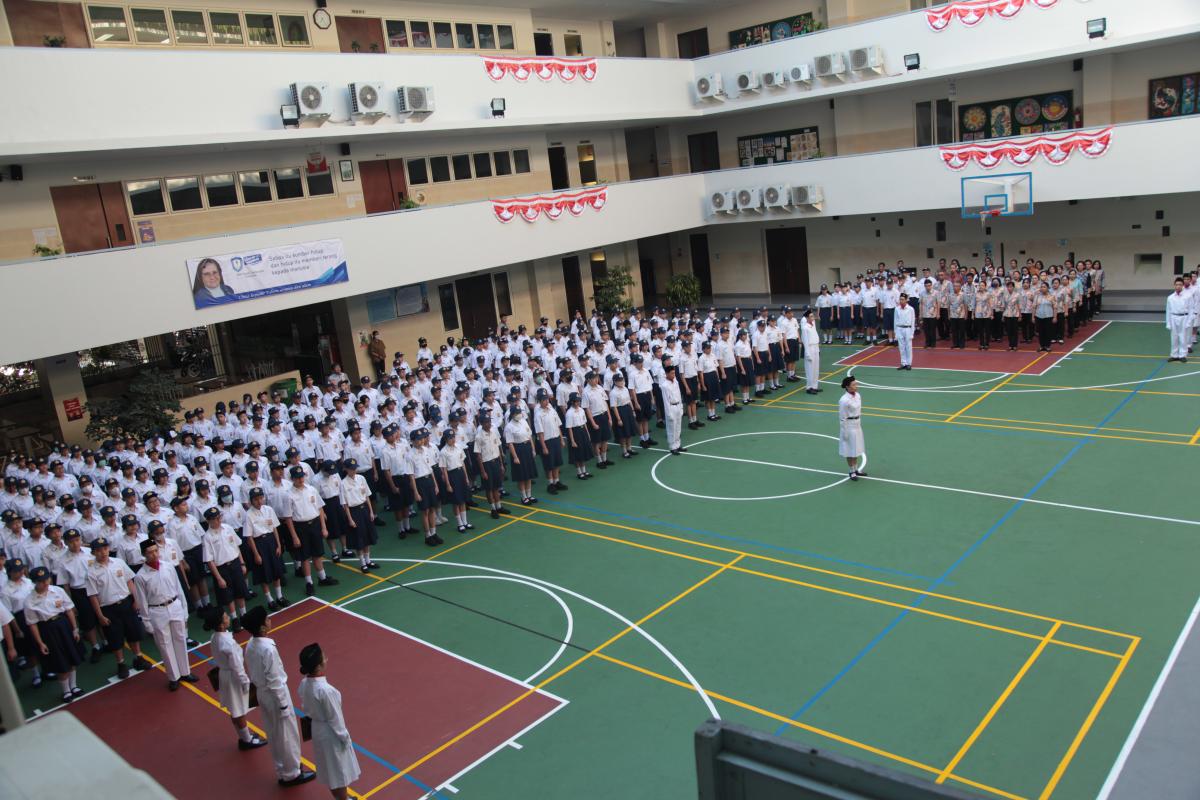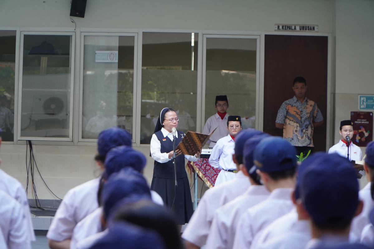 Upacara memperingati Hari Ulang Tahun Kemerdekaan Republik Indonesia ke 79 di SMP Katolik Santa Clara Surabaya, Sabtu (17/8). Sr. Elisabeth Hardiantinawati, MC, S.Pd., M.Pd. bertindak sebagai pembina upacara. Seluruh peserta mengikuti upacara dengan khidmat.