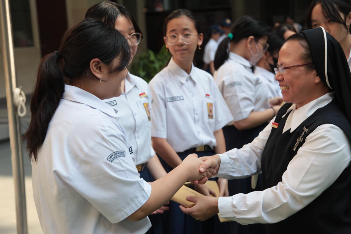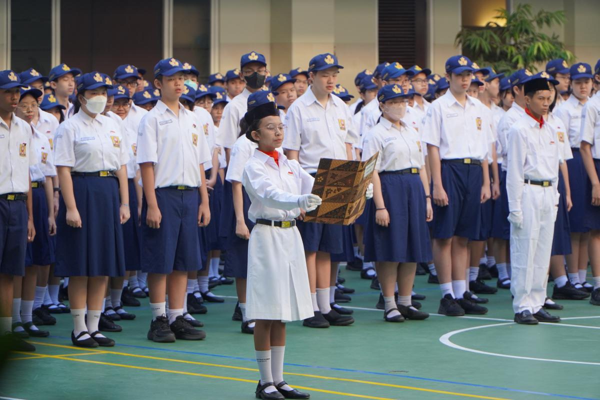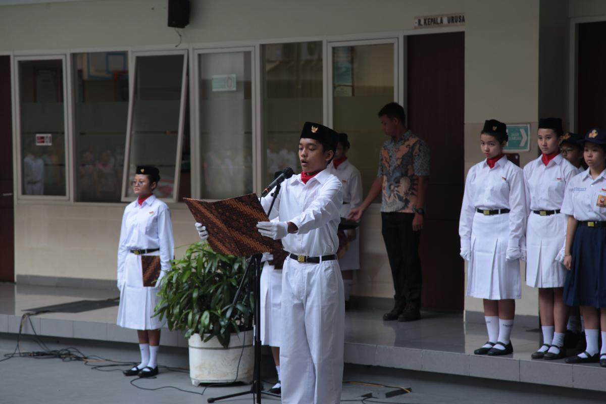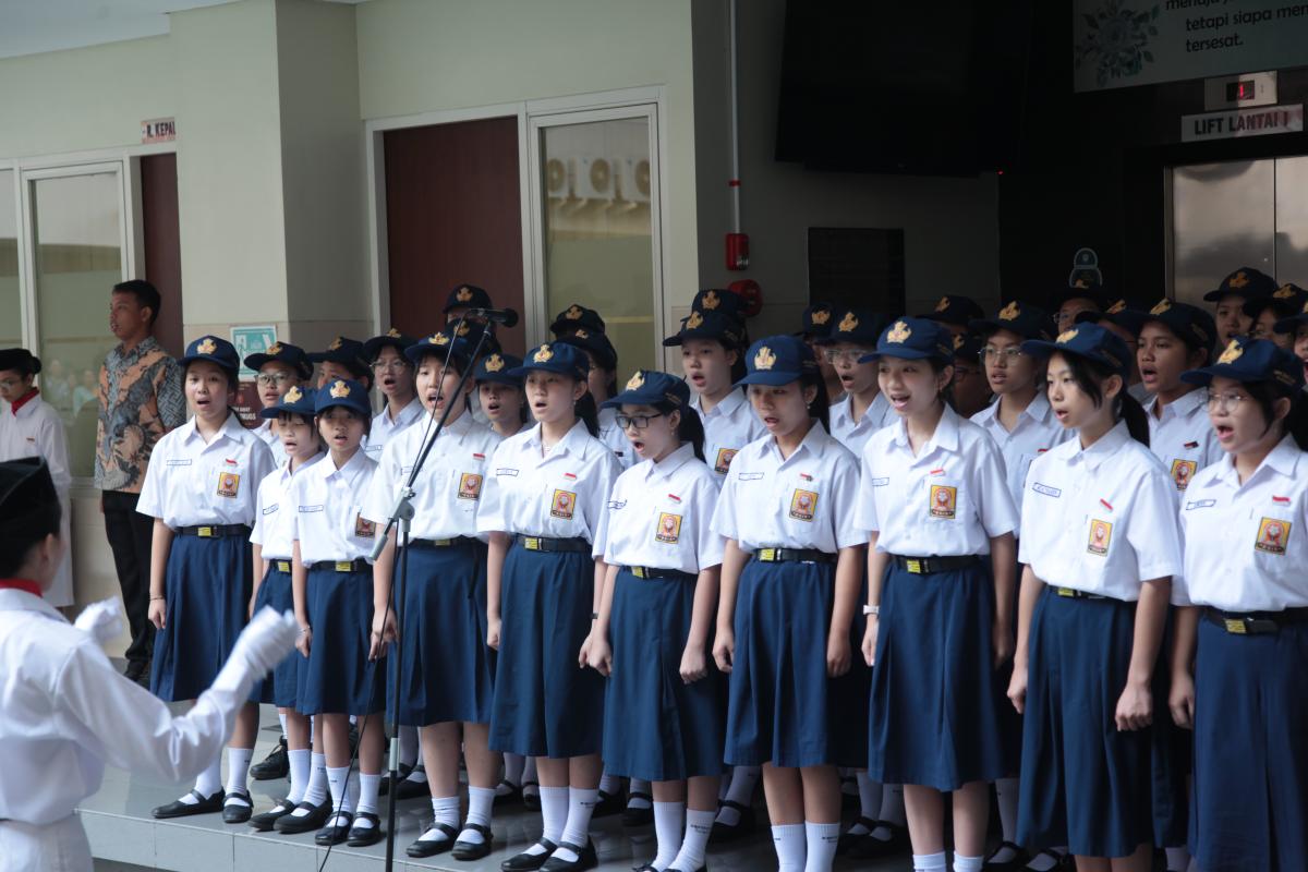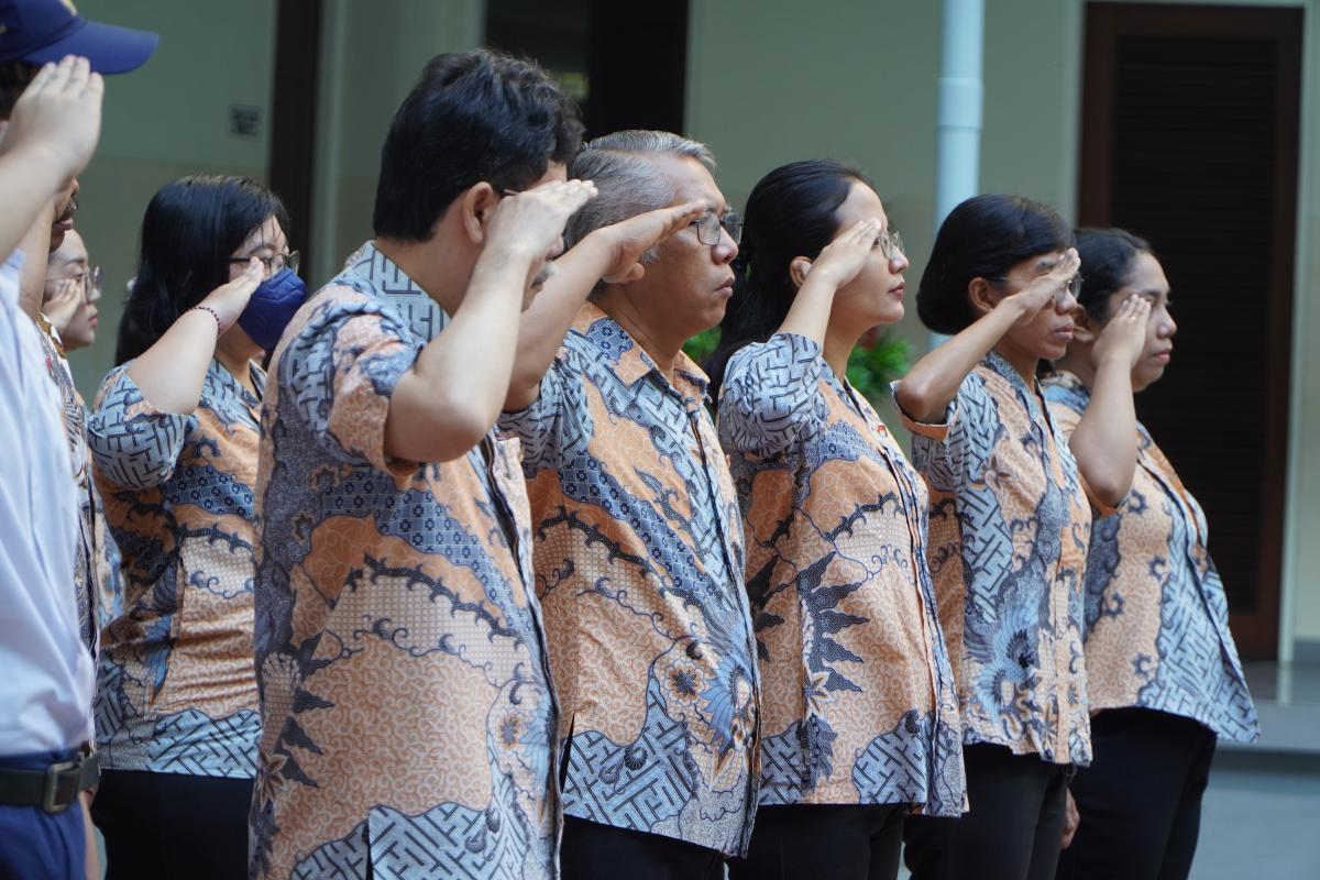Upacara memperingati Hari Ulang Tahun Kemerdekaan Republik Indonesia ke 79 di SMP Katolik Santa Clara Surabaya, Sabtu (17/8). Sr. Elisabeth Hardiantinawati, MC, S.Pd., M.Pd. bertindak sebagai pembina upacara. Seluruh peserta mengikuti upacara dengan khidmat.