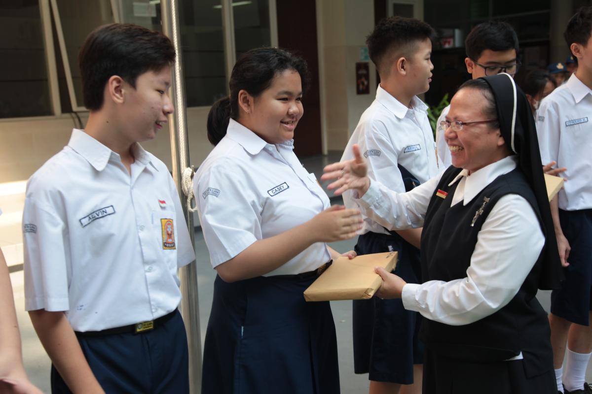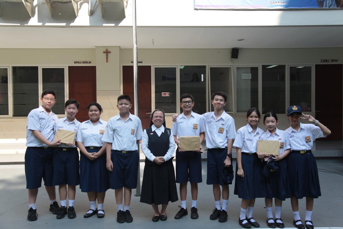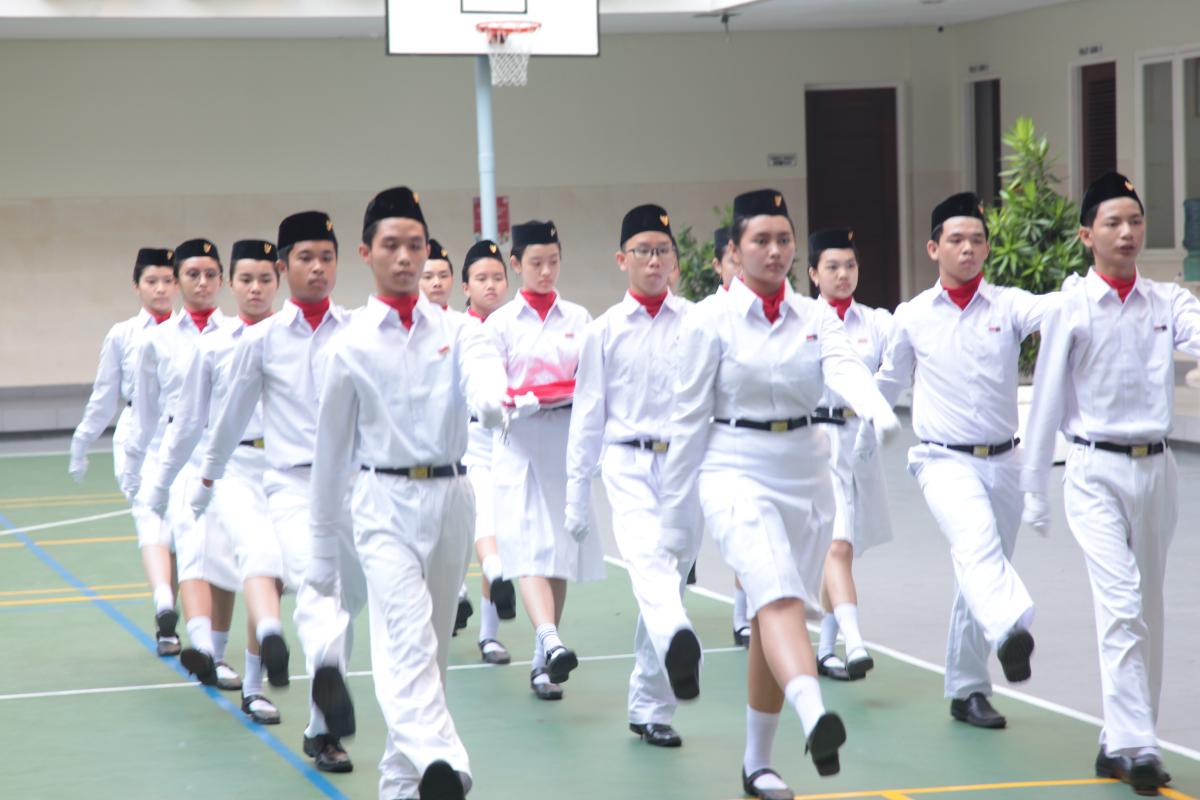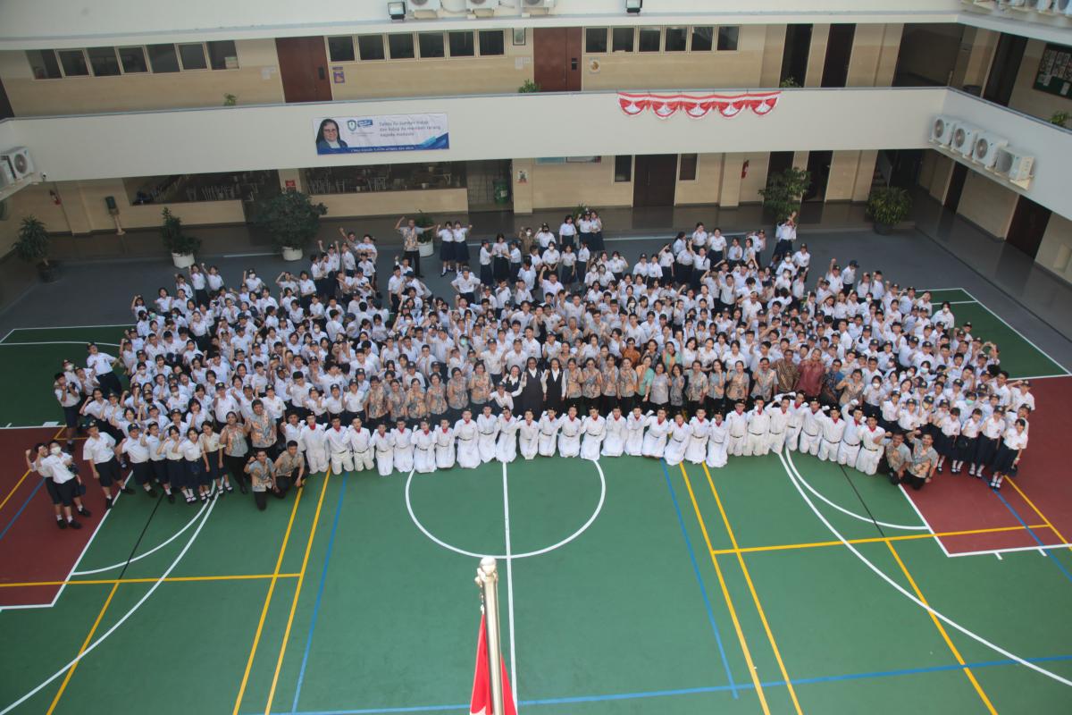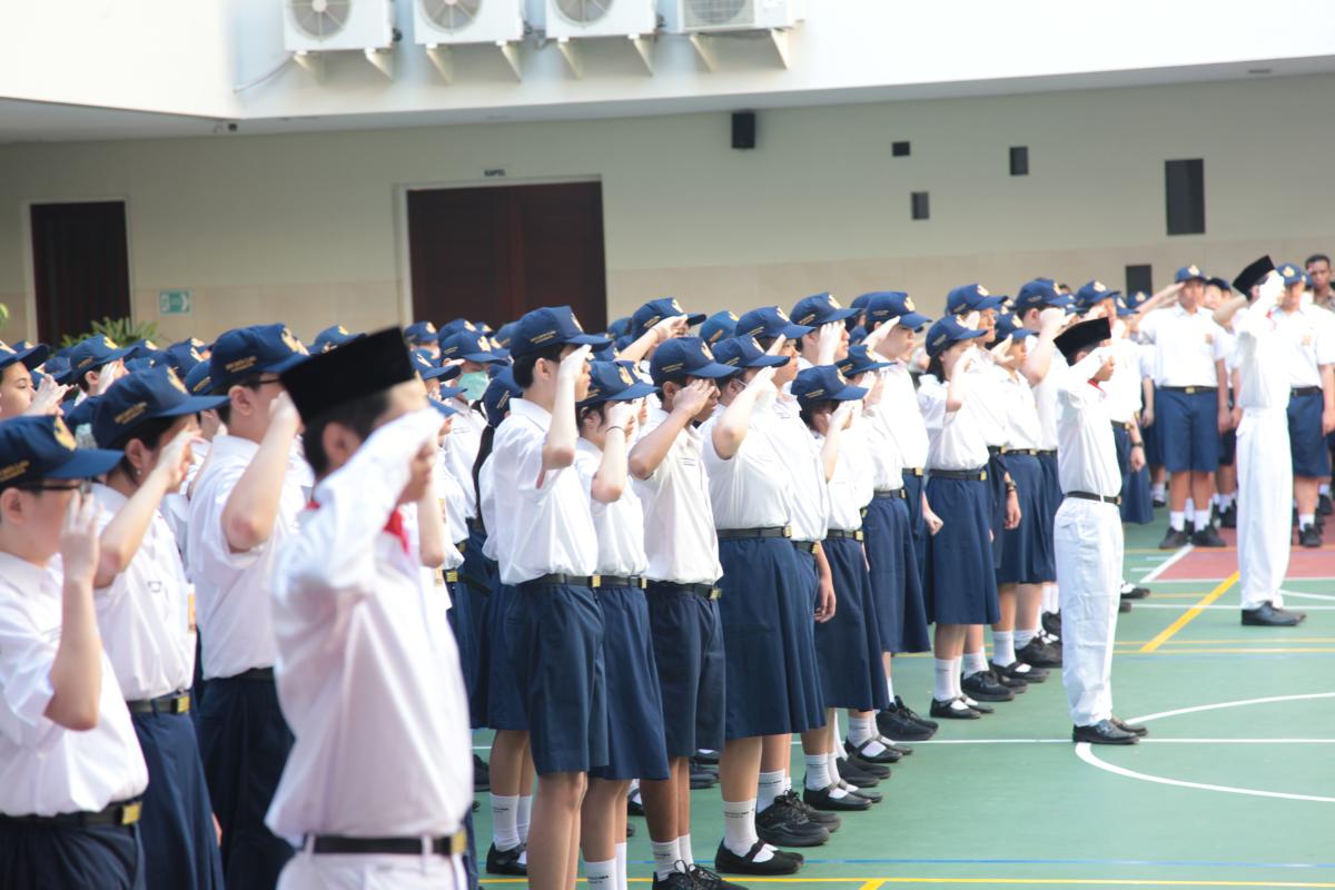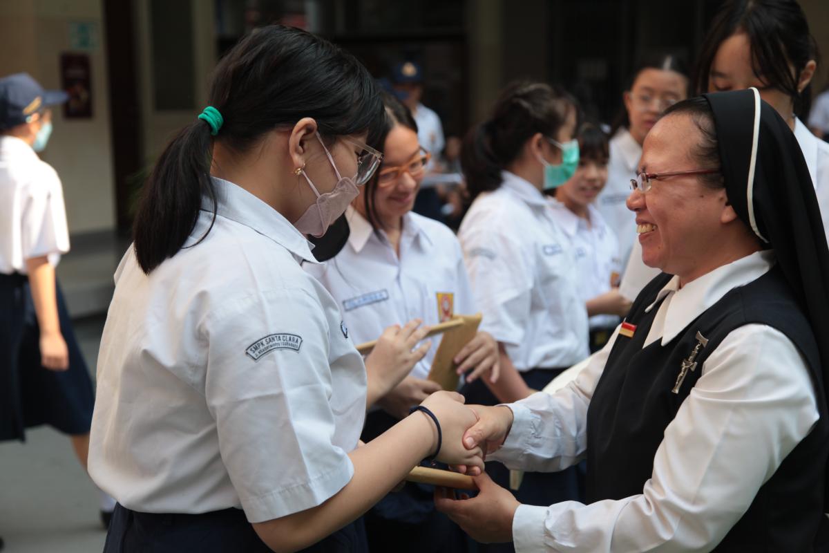 Upacara memperingati Hari Ulang Tahun Kemerdekaan Republik Indonesia ke 79 di SMP Katolik Santa Clara Surabaya, Sabtu (17/8). Sr. Elisabeth Hardiantinawati, MC, S.Pd., M.Pd. bertindak sebagai pembina upacara. Seluruh peserta mengikuti upacara dengan khidmat.