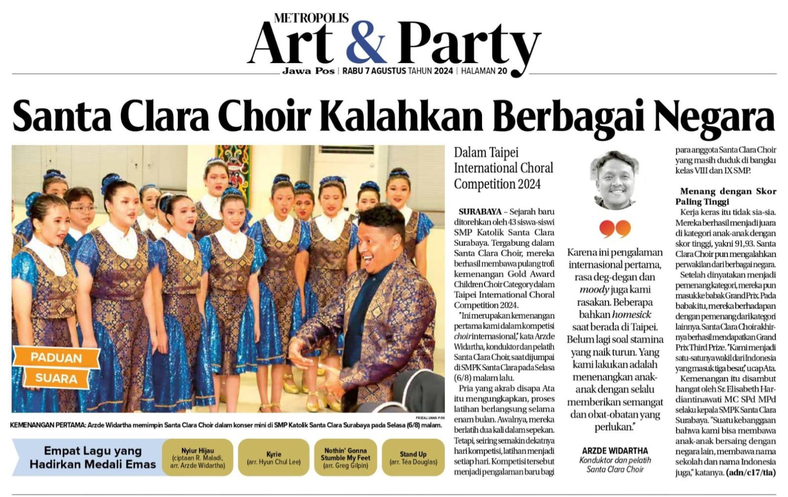 Dalam Taipei International Choral Competition 2024 SURABAYA – Sejarah baru ditorehkan oleh 43 siswa-siswi SMP Katolik Santa Clara Surabaya. Tergabung dalam Santa Clara Choir, mereka berhasil membawa pulang trofi kemenangan Gold Award Children Choir Category dalam Taipei International Choral Competition 2024. “Ini merupakan kemenangan pertama kami dalam kompetisi choirinternasional,” kata Arzde Widartha, konduktordan pelatih Santa Clara Choir, saat dijumpai di SMPK Santa Clara pada Selasa (6/8) malam lalu. Pria yang akrab disapa Ata itu mengungkapkan,