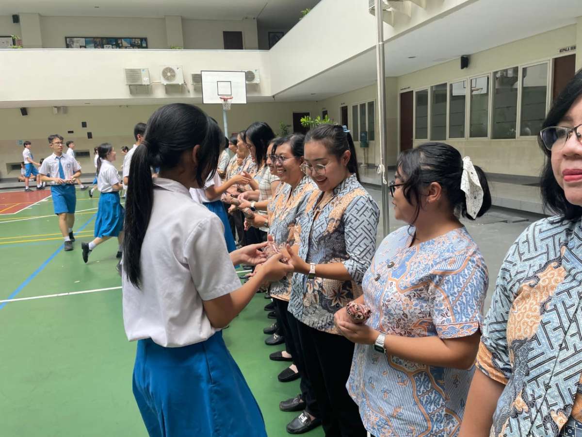 Sebagai penutup upacara, suasana menjadi semakin hangat saat perwakilan siswa memberikan hadiah kepada kepala sekolah, seluruh guru dan tenaga kependidikan sebagai bentuk apresiasi atas dedikasi mereka dalam dunia pendidikan.